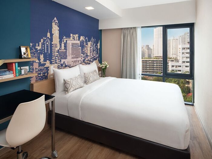 静かな地区にあるサービスアパートメントです。でも豪華で広々家のように快適薄型ケーブルテレビがあります。 DVDプレーヤー、セーフティボックス、ゲストはタイ式マッサージでリラックスできます。バンコクの美しい夕日の景色を望むフィットネスセンターと屋上スイミングプールがあります。コンチネンタルブレックファーストがあり、ルームサービスを利用できます。簡易キッチンがあります。 BTSナナ駅への無料Wi-Fiと24時間無料のトゥクトゥクサービス。